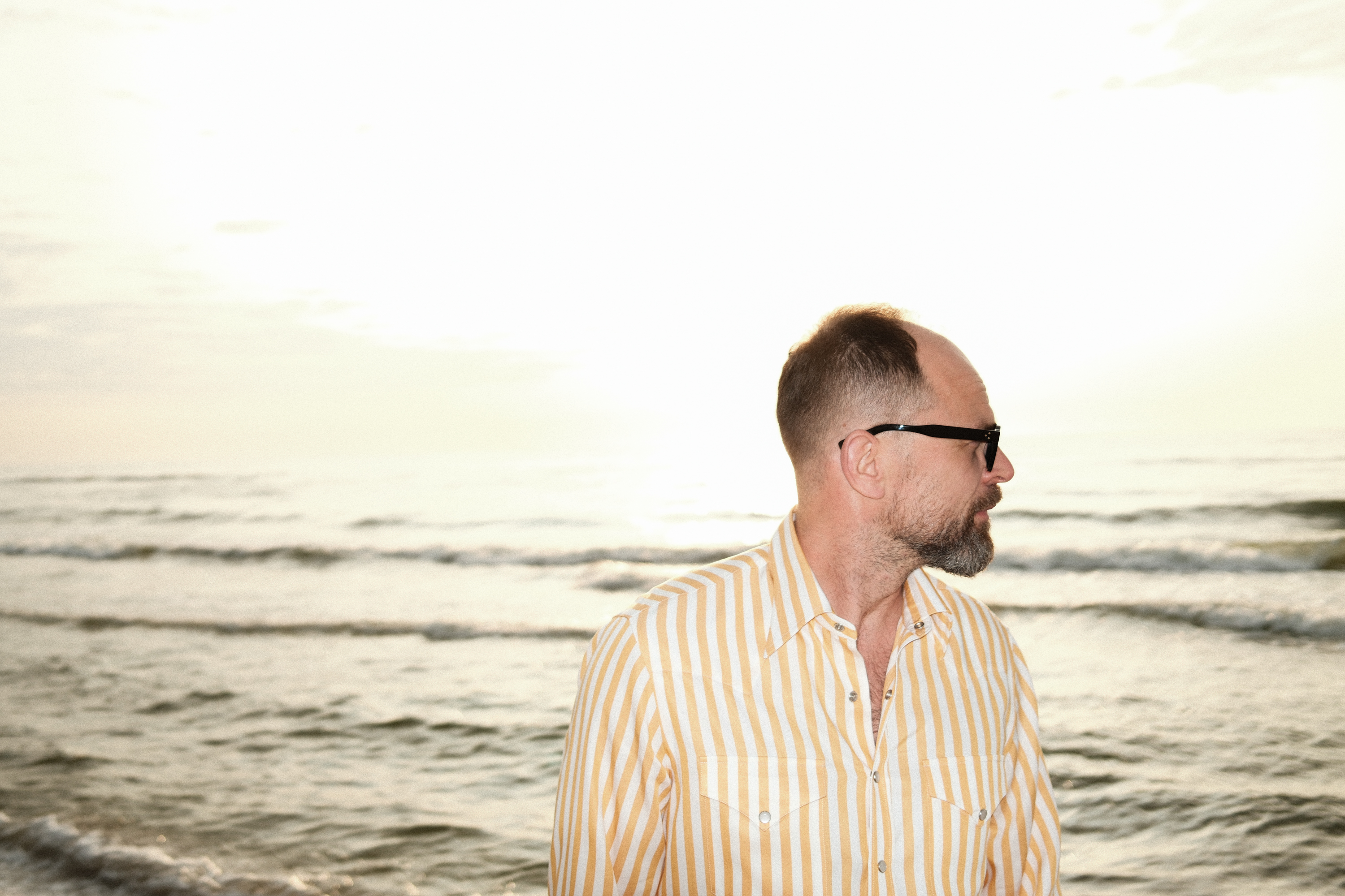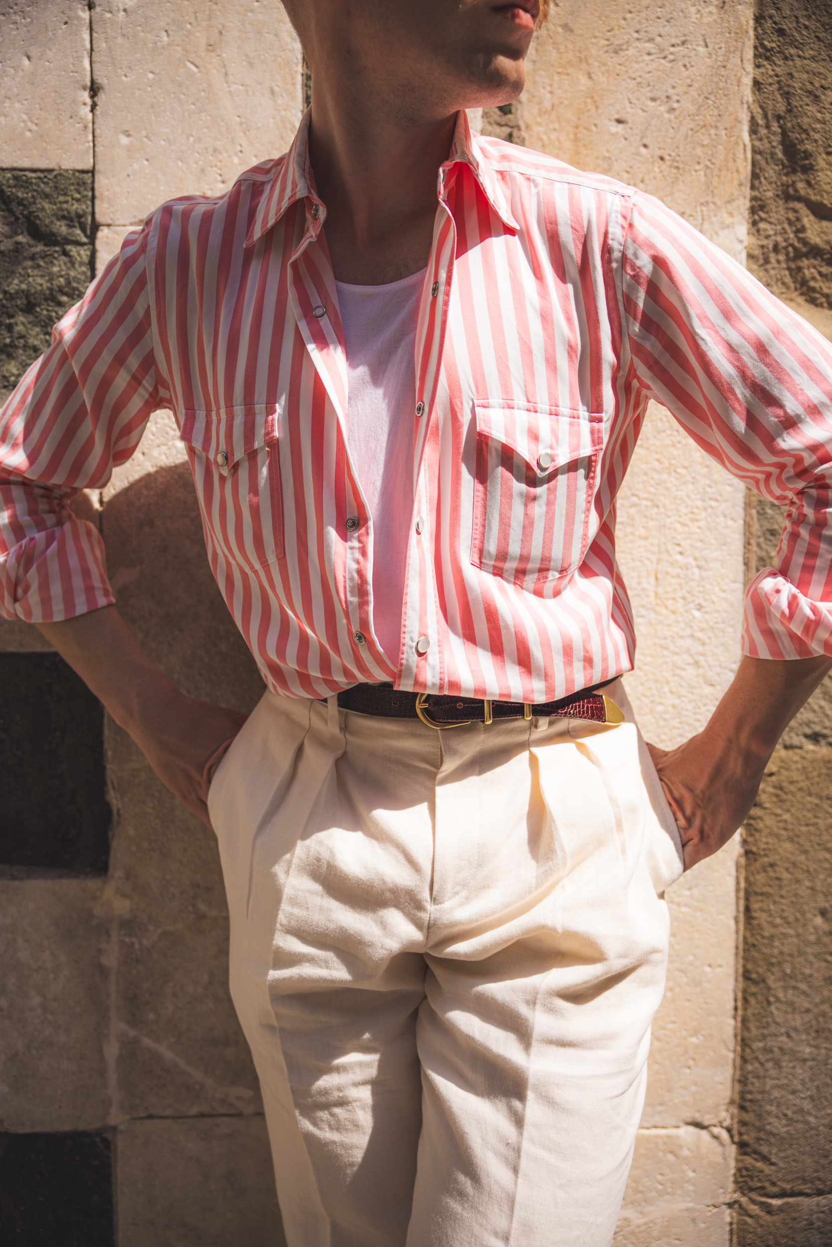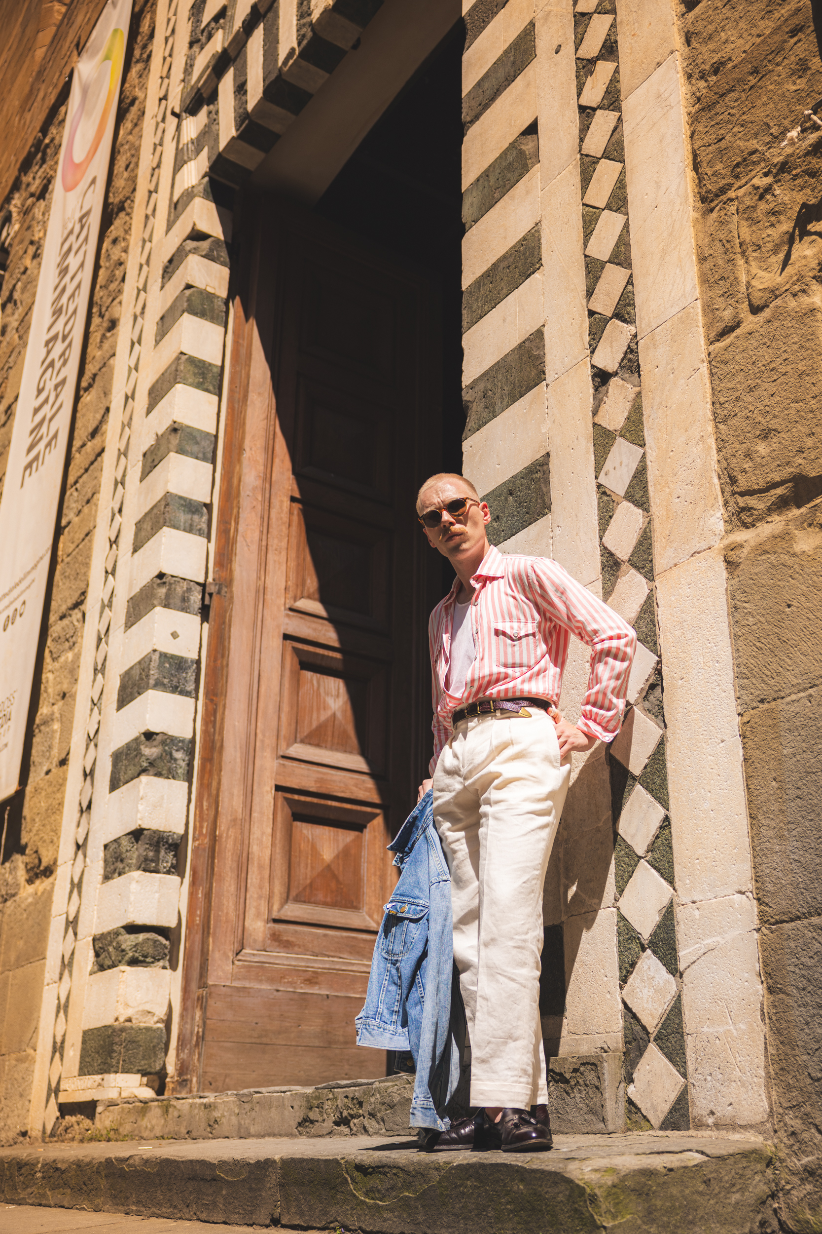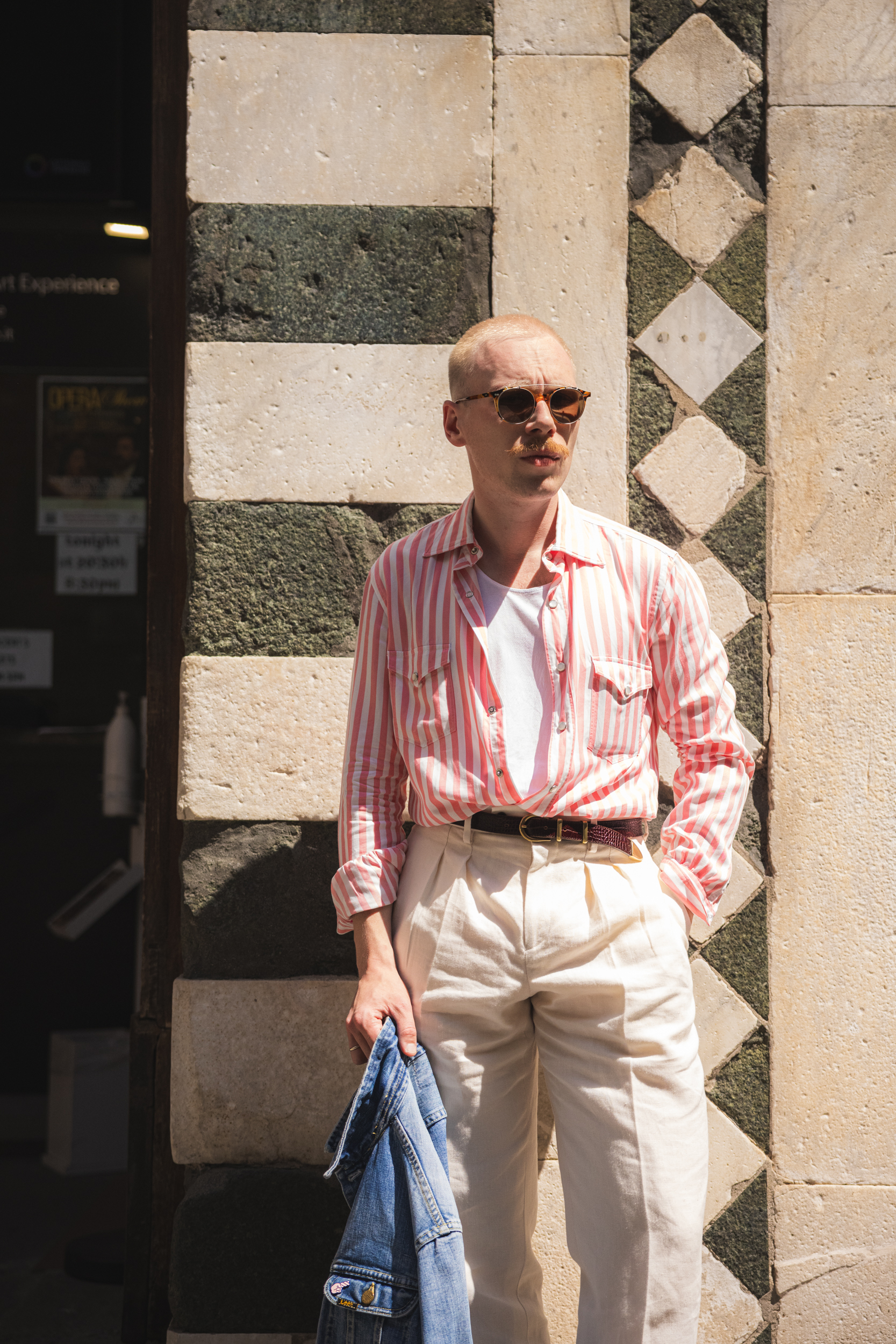 Gdyby na zewnątrz było nieco chłodniej, chętnie dorzuciłbym na wierzch nie tylko dżinsową kurtkę, ale i marynarkę, nie zmieniając nic innego. Albo taką od kompletu, tworząc garnitur, albo np. blezer lub inną ciemną, letnią opcję dla kontrastu. Szeroki prążek w mocnym kolorze i mój ulubiony kołnierzyk z długimi wyłogami dobrze obroniłyby się w tym towarzystwie.